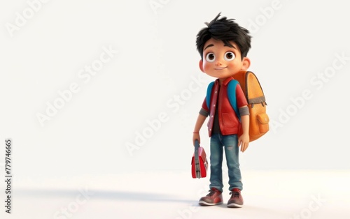 Young boy with school bag, stylized cartoon character, school kid 3d rendering