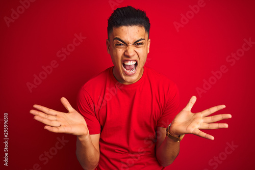 Young brazilian man wearing t-shirt standing over isolated red background celebrating crazy and amazed for success with arms raised and open eyes screaming excited. Winner concept