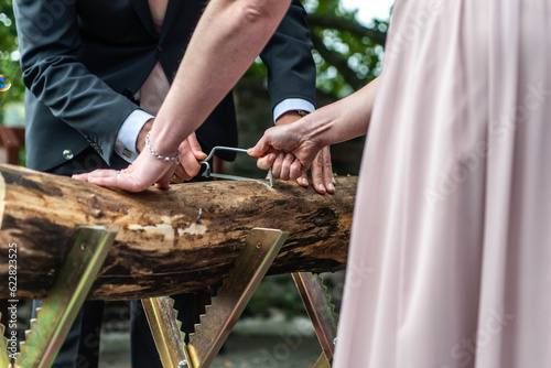 saw, log, marriage, wood, party, celebration, bride, groom, usage, outdoors, traditional, buck, ritual, female, stem, white, man, woman, bridal couple, wedlock, wedding, wedding ceremony, sawing, wedding, tree trunk, alliance, legend, married couple, gown, husband, tree, wife, decorated, tree trunk, rose, floral, german, celebratory, sawhorse, play, marrying, happiness, tree branch