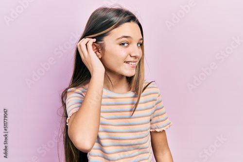 Young brunette girl wearing casual striped t shirt smiling with hand over ear listening and hearing to rumor or gossip. deafness concept.