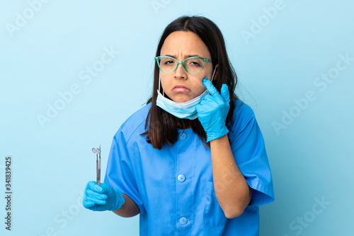 Young brunette mixed race dentist woman holding tools over isolated background showing something