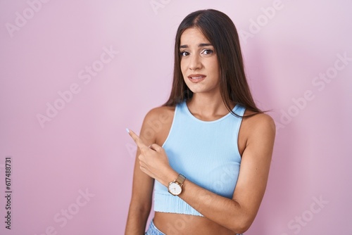 Young brunette woman standing over pink background pointing aside worried and nervous with forefinger, concerned and surprised expression