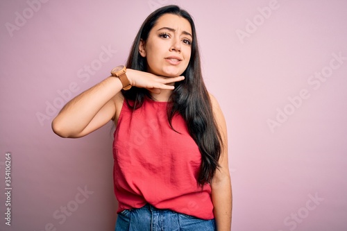 Young brunette woman wearing casual summer shirt over pink isolated background cutting throat with hand as knife, threaten aggression with furious violence