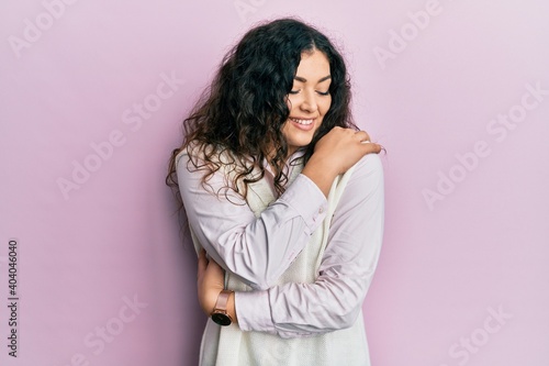 Young brunette woman with curly hair wearing casual clothes hugging oneself happy and positive, smiling confident. self love and self care