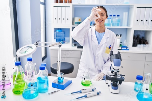 Young brunette woman working at scientist laboratory smiling happy doing ok sign with hand on eye looking through fingers