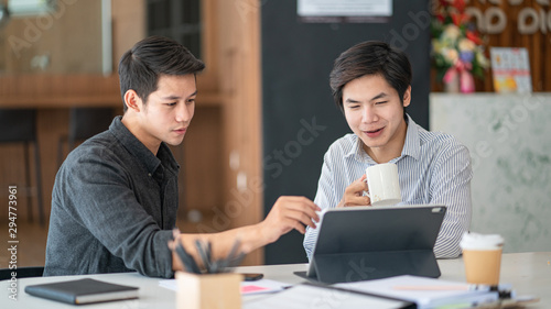 Young business colleagues talking with digital tablet in modern office.