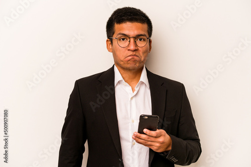 Young business hispanic man holding mobile phone isolated on white background shrugs shoulders and open eyes confused.