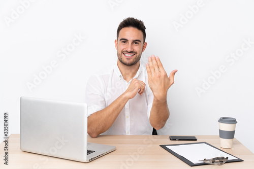 man, man, people, person, background, business, businessman, work, men at work, boss, to sit, seat, table, sitting, office, laptop, computer, technology, notebook, tech, working, document, cyberspace, inviting, invite, arriving, hand, cool, here, call, friends, advertisement, concept, gesture, palm, presenting, showing