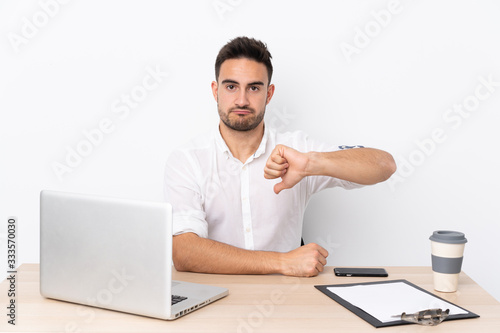 Young business man with a mobile phone in a workplace showing thumb down sign