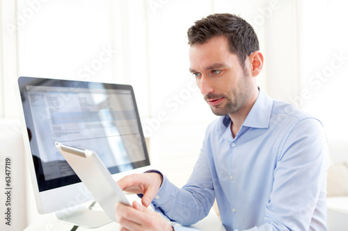 Young business man working at home on his tablet
