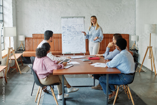 young business people meeting office teamwork group whiteboard presentation seminar woman businesswoman startup project idea student education training