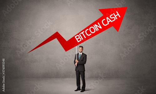 Young business person in casual holding road sign with BITCOIN CASH inscription, business direction concept