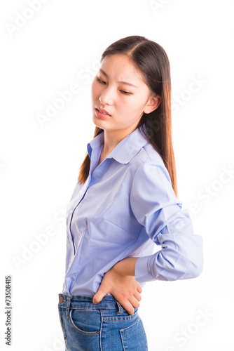 20s, asian, chinese, ache, backache, black hair, brow, business, businesswoman, confident, emotion, expression, fatigue, feeling, frown, hand, ill, isolated, massaging, looking down, massage, mow, occupation, one person, painful, people, person, portrait, sentiment, sick, staff, standing, suffering, sleepy, waist, white-collar, young