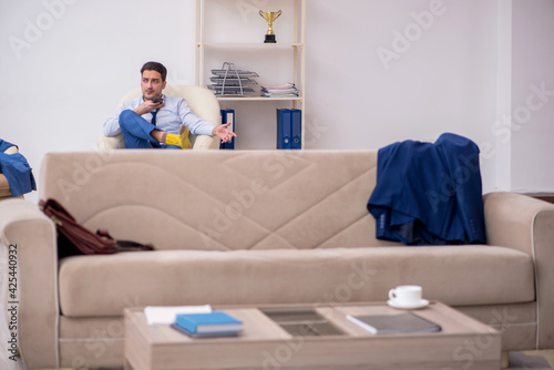 man, businessman, meeting, waiting, business, sitting, armchair, armchair, sleepy, exhausted, fatigue, sad, stressed, frustrated, stress, unhappy, smartphone, mobile, phone, speaking, talking, discussing, explaining, interview, employee, employer, long, hours, punctual, punctuality, accountant, applicant, appointment, auditor, await, candidate, adviser, impatient, late, lawyer, management, manager, patience, time, timely, visit, wait, office, boss