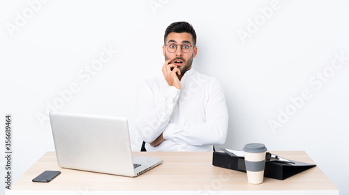 table, office, laptop, computer, technology, notebook, tech, work, cyberspace, man, man, people, person, male, photogenic, adult, isolated, business, businessman, men at work, manager, businessperson, boss, surprised, surprise, expression, face, expressive, mouth, stress, shocked, amazement, wow, astonished, head, open, wide, emotional, shock, amazing