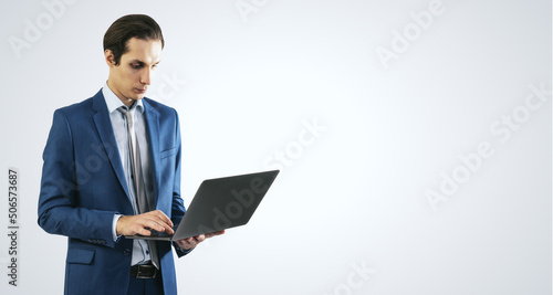 Young businessman in blue suit working with modern laptop, isolated on light grey wall background, with empty space for you text or logo, mockup