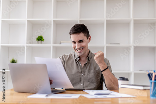 Young businessman sits in his office with a laptop, he looks delighted as he reads the documents that the company is profitable, he is a young businessman who is skilled in running the company to grow