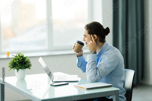 Young businessman using computer and drinking coffee in office. Handsome man on coffee break