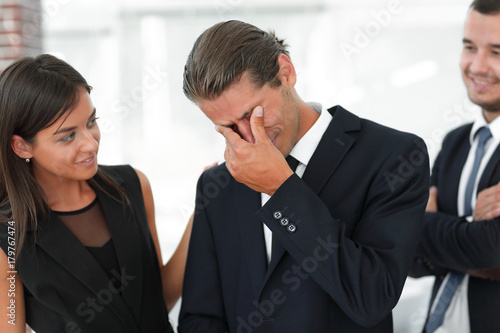 young businessman with tears of joy and his business team