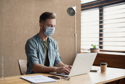 Young businessman working in office wearing medical protective face mask. Creative professional using laptop. Business, epidemic, pandemic, corona virus protection, healthy lifestyle, people concept