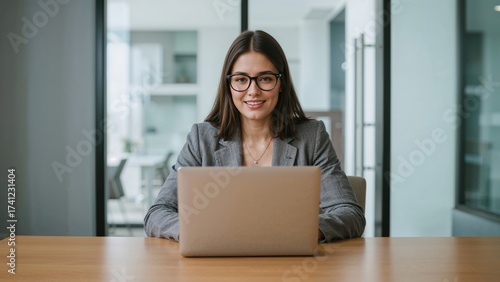 Young businesswoman in a gray suit working on a laptop at a modern boardroom table with a professional demeanor and glasses, focused on her tasks.