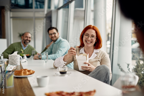 break, lunch, business, office, co-worker, businesswoman, businessman, caucasian, colleague, communicating, eating, entrepreneur, food, friends, group, happy, job, lunch break, manager, people, relaxation, take-away, take-out, talking, togetherness, white, woman, work, workplace, enjoying