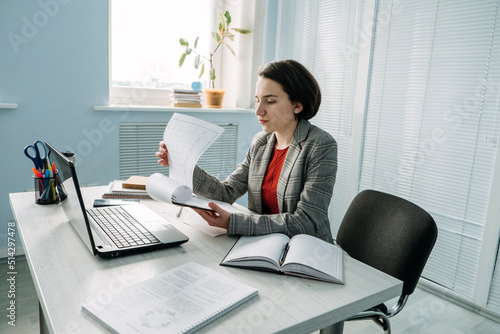Young Businesswoman, manager sitting at table in office and do notes in diary and calendar