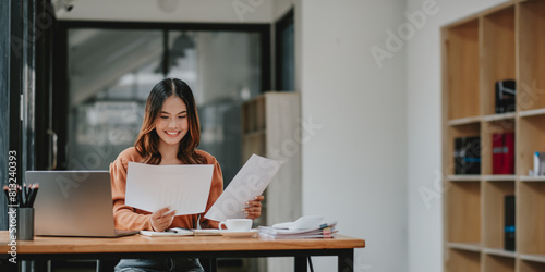 Young businesswoman reviews financial documents, exuding confidence and contentment at her organized workspace.