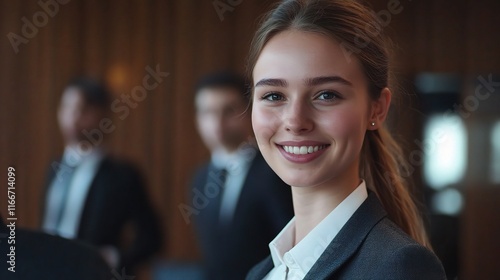 Young Businesswoman Smiling in Formal Wear at Corporate Office