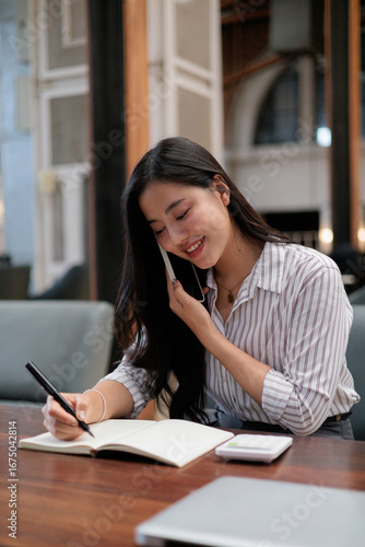 businesswoman, phone, office, woman, business, work, working, laptop, notebook, writing, note, call, talking, smartphone, mobile, communication, technology, desk, workspace, modern, professional, career, entrepreneur, freelance, startup, asia, asian, young, adult, female, smile, happy, cheerful, elegant, stylish, indoor, interior, design, architecture, natural, light, day, vertical, 1, person, looking