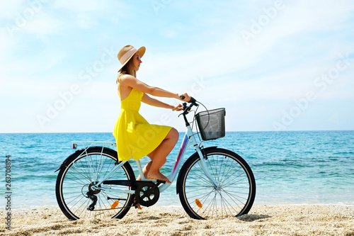 ocean, beach, woman, bicycle, sea, people, bike, sand, straw, hat, attractive, summer, travel, vacation, lifestyle, sky, young, nature, girl, female, happy, beauty, healthy, recreation, freedom, coast, fun, water, holiday, active, biking, sport, life, happiness, fashion, pretty, relax, ride, blue, sunny, carefree, tropical, holiday maker, caucasian, dress, yellow, basket, back, bright