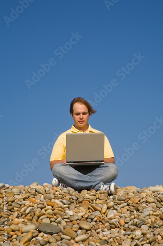 young casual man with laptop at the beach