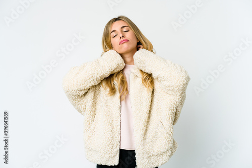 Young caucasian blonde woman suffering neck pain due to sedentary lifestyle.