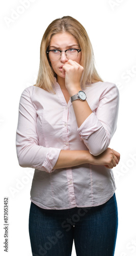 Young caucasian business woman wearing glasses over isolated background looking stressed and nervous with hands on mouth biting nails. Anxiety problem.