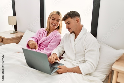 Young caucasian couple smiling happy using laptop sitting on the bed at home.