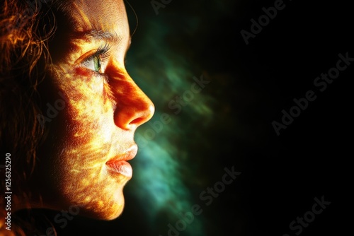 young, caucasian, female, fiery, light, profile, face, side, glowing, intense, eye, woman, vibrant, dramatic, closeup, artistic, illuminated, texture, shadow, gaze, concentration, expression, warm, colours, contrast, mysterious, atmosphere, soft, depth, aethereal, detail, highlight, sharpened, intensity, surface, pattern, portrait, contemplation, high-coloured, energy, imagination, creativity, sensitive, inner, earth, surreal