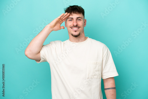 Young caucasian handsome man isolated on blue background saluting with hand with happy expression