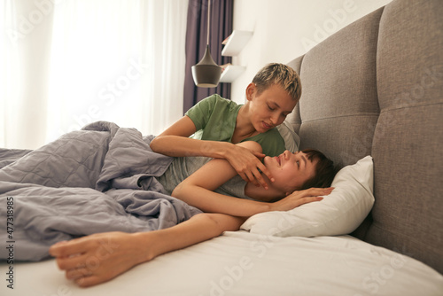 home, apartment, flat, modern, interior, indoor, roomy, beautiful, domestic, lifestyle, couple, girlfriend, young, caucasian, together, togetherness, human relationships, woman, girl, love, lesbian, homosexual, female, bedchamber, day, morning, european, brunette, blond, bed, blanket, pillow, closeness, lay, lying, smiling, rest, relax, smile, hugs, embracing, hug, hugging, touch, face, touching, tender, tenderness