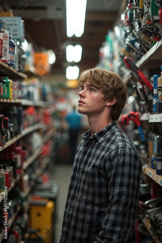 mechanic, choice, solution, task, shelf, lighting, retail, caucasian, selection, standing, store, bricolage, male, concentration, finding, supply, exploring, purchase, equipment, blond, focused, problem solving, discovery, interest, home improvement, indoor, young, handyman, casual attire, shopping, inventory, hardware, spare time, solitude, tool, supply, thinking, decision, browsing, shopper, flannel, aisle