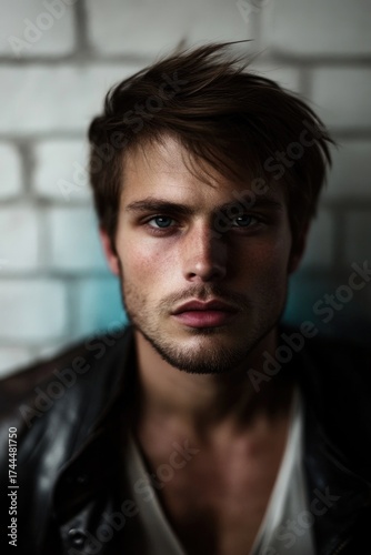 young, caucasian, male, tousled, hair, leather, jacket, brick, wall, portrait, intense, gaze, serious, expression, fashion, style, confident, edgy, casual attire, rugged, cool, modern, urban, artistic, moody, shadow, depth, strong, face, detailed, eye, beard, photogenic, trendy, contemporary, texture, white, shirt, mysterious, lighting, contrast, sharpened, coiffure