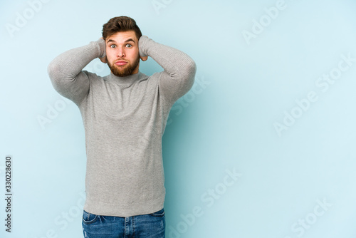 Young caucasian man isolated on blue background covering ears with hands trying not to hear too loud sound.