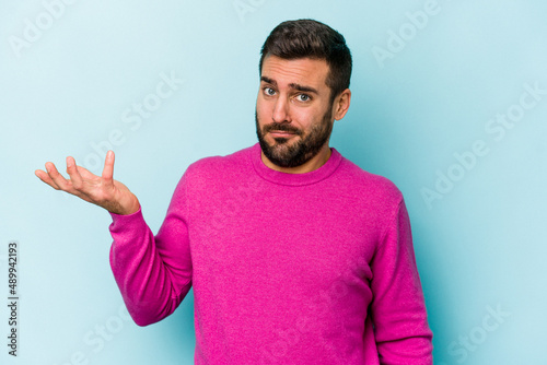 Young caucasian man isolated on blue background doubting and shrugging shoulders in questioning gesture.