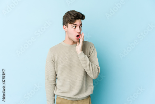 Young caucasian man isolated on blue background is saying a secret hot braking news and looking aside