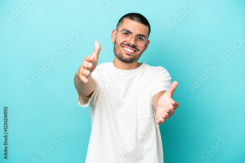 Young caucasian man isolated on blue background presenting and inviting to come with hand
