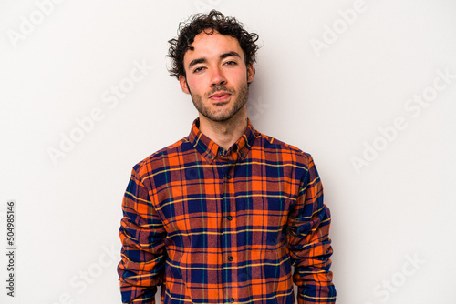 Young caucasian man isolated on white background blows cheeks, has tired expression. Facial expression concept.