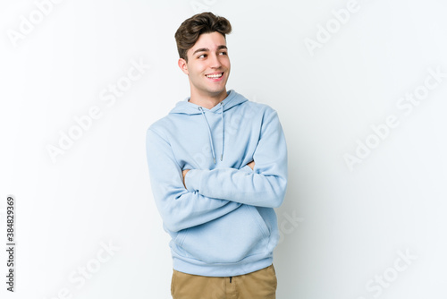 Young caucasian man isolated on white background smiling confident with crossed arms.