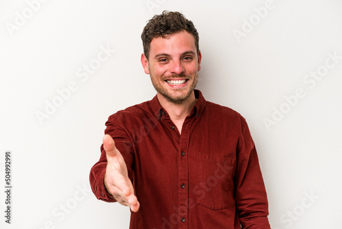Young caucasian man isolated on white background stretching hand at camera in greeting gesture.