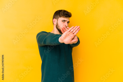 Young caucasian man isolated on yellow background standing with outstretched hand showing stop sign, preventing you.