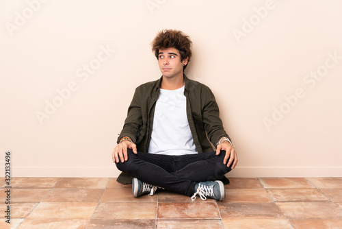 Young caucasian man sitting on the floor making doubts gesture looking side