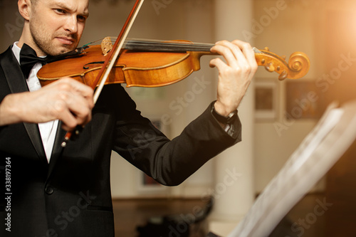 young caucasian talented gorgeous man un tux play violin, professional musician practice performance, use classic instrument . music concept